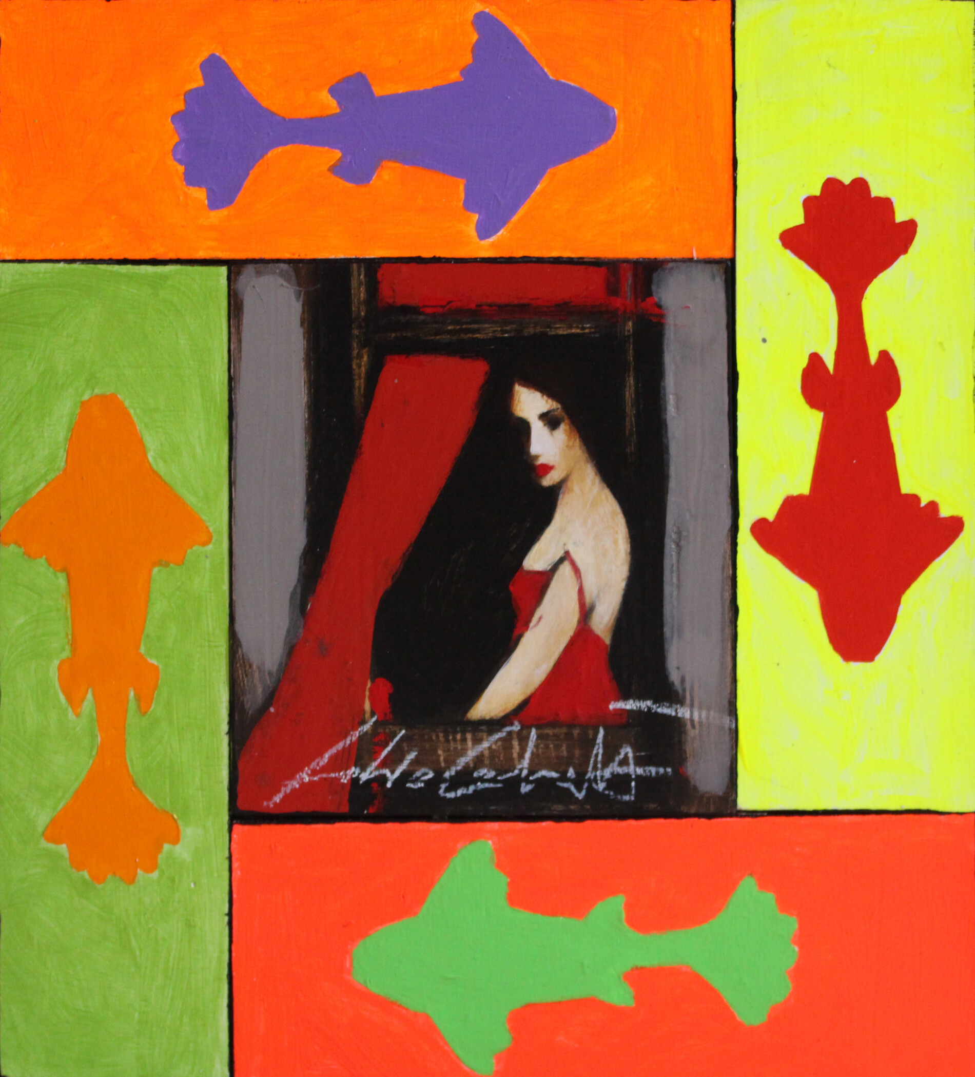 All’interno di una cornice molto colorata e brillante, l’artista italiano Fabio Calvetti dipinge una scena che al contrario è pervasa da una luce molto delicata. In questo dipinto su legno di piccole dimensioni, una donna guarda lo spettatore, avvolta dalla semioscurità. Come da tratto distintivo dell’autore, il rosso è molto presente e vuole rimarcare la connotazione sensuale delle sue opere.