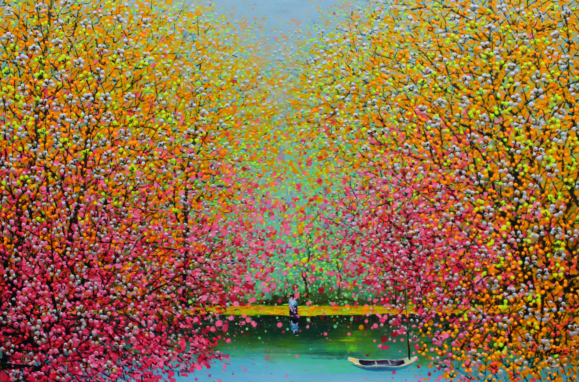 In questa grande opera dell’artista cinese Je Shen, un’esplosione di rosa e giallo illumina la tela, con fiori dai colori vivaci che diffondono una luce calda e avvolgente. Un laghetto calmo riflette queste delicata sfumature, mentre un ragazzo seduto sulla riva si perde in un momento di profonda contemplazione. L’atmosfera sospesa, quasi onirica, trasporta lo spettatore in una pausa di quiete e meraviglia, invitandolo a immergersi in un istante di pace senza tempo.