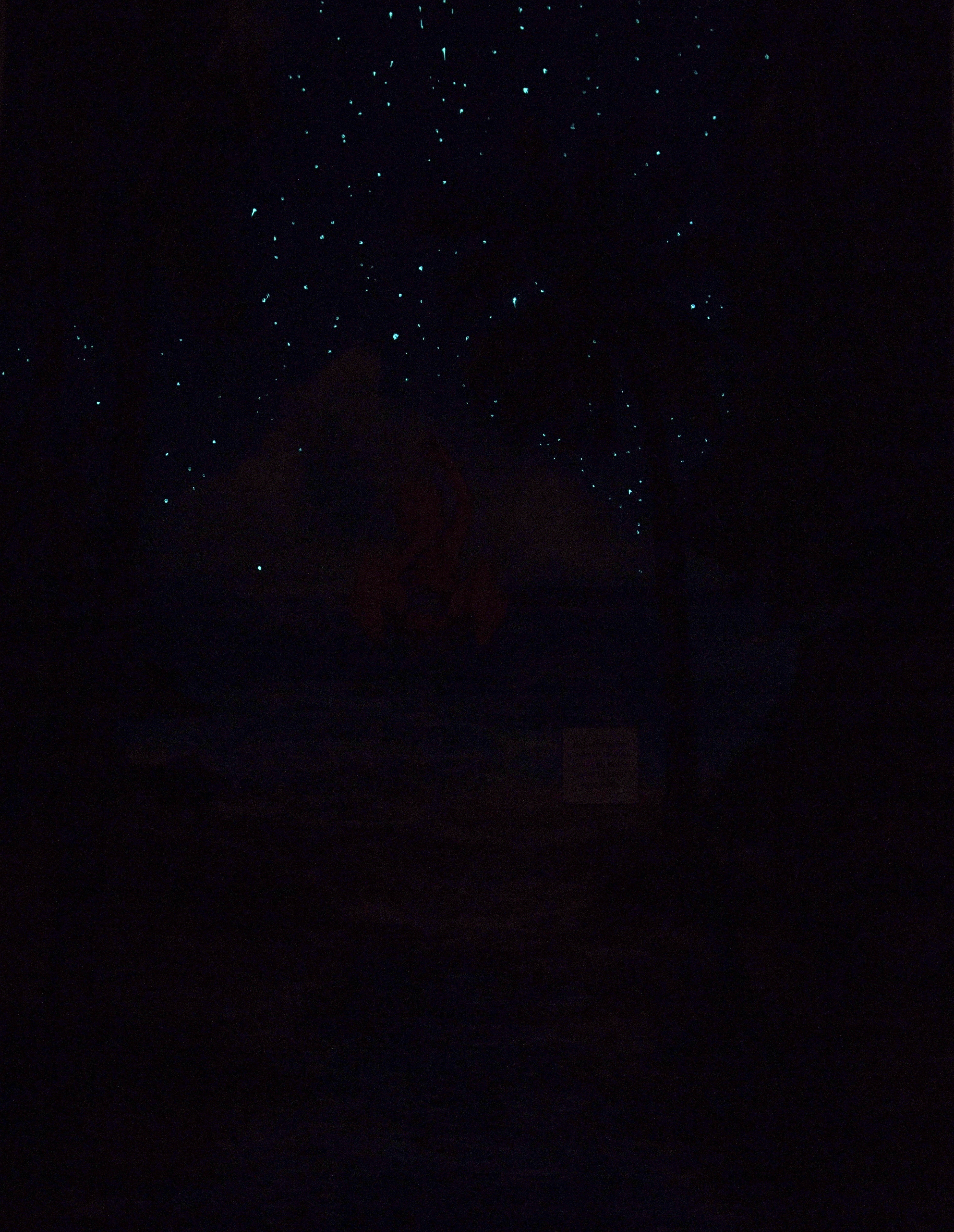 Una visione giocosa e acquatica, dove macchie vivaci sembrano affiorare da un lago mentale. Alla luce naturale, “Splash” è un inno all’energia primordiale del colore e alla dimensione giocosa dell'infanzia; sotto UV, compaiono dettagli fluorescenti che suggeriscono riflessi notturni e vibrazioni emotive. Al buio, l’opera esplode di luce propria, trasformandosi in un universo liquido e interiore, dove lo spettatore si immerge come in un sogno lucido.
