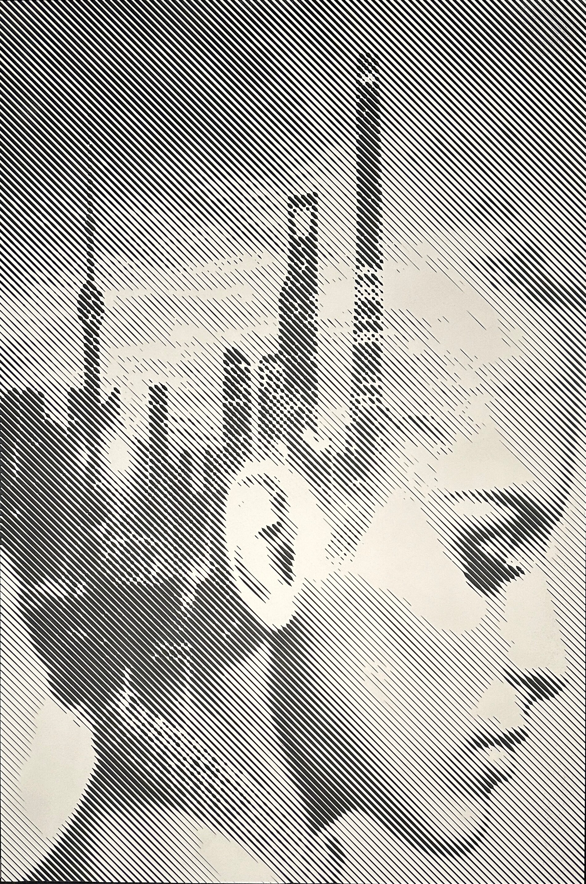 Questo quadro di grandi dimensioni a tecnica mista su legno di Enrico Pazzoni rappresenta il volto di una donna di profilo. Inizialmente la sensazione è quella di trovarsi di fronte ad una stampa, una fotografia, forse un fumetto. Avvicinandosi al quadro però il comfort scompare, lasciando spazio al disorientamento, alla perdizione, al limite dell’ipnotico. La testa della donna non è completa e la parte superiore è occupata dallo skyline di una grande città. Linee su linee, in forte contrasto tra loro grazie all’utilizzo di pesanti e sature vernici creano una tavola dalla quale è impossibile distogliere lo sguardo.