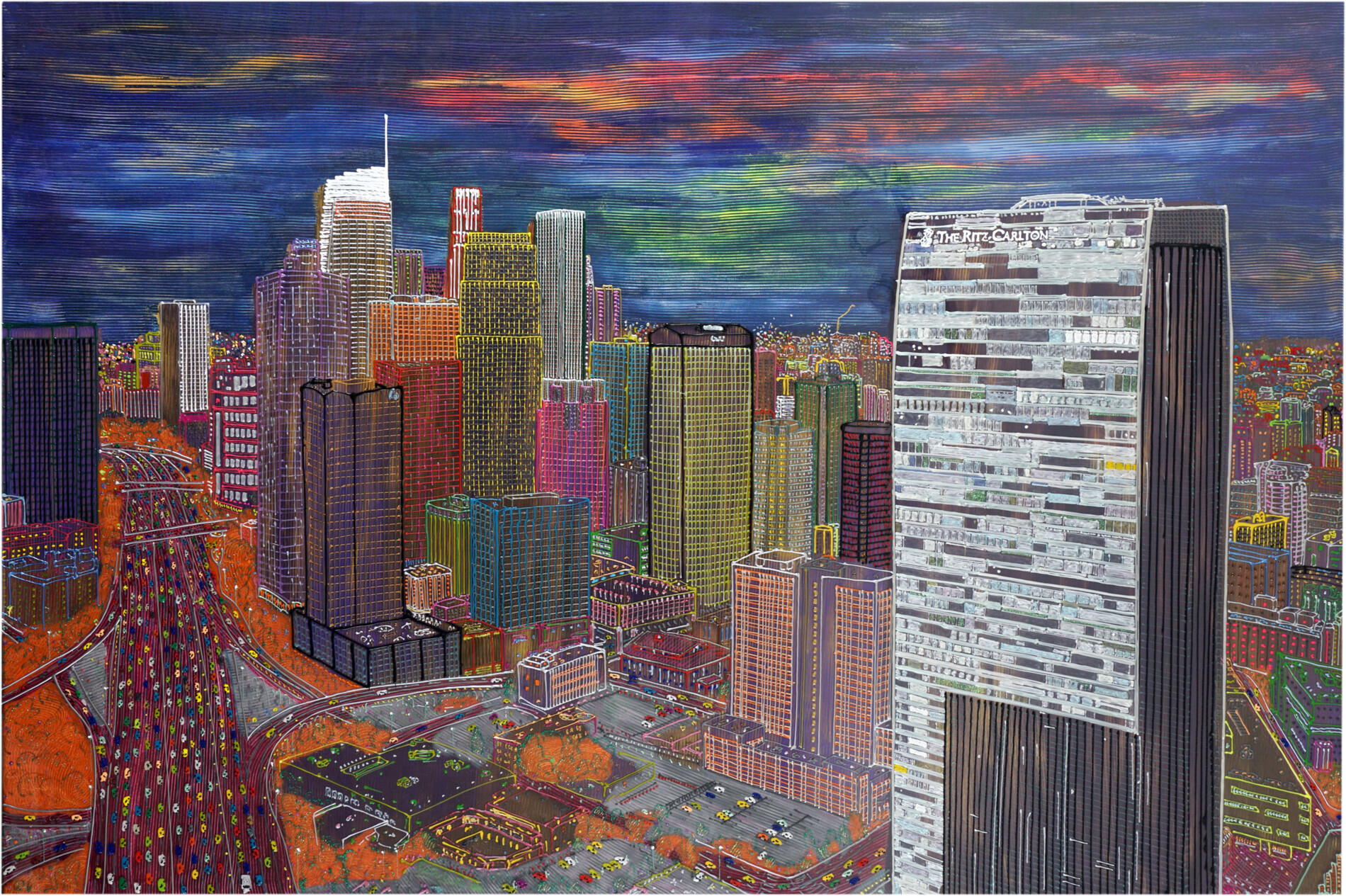 L’artista osserva Los Angeles dall’alto e ne restituisce la sua doppia natura: rigorosa e caotica, geometrica e vibrante.