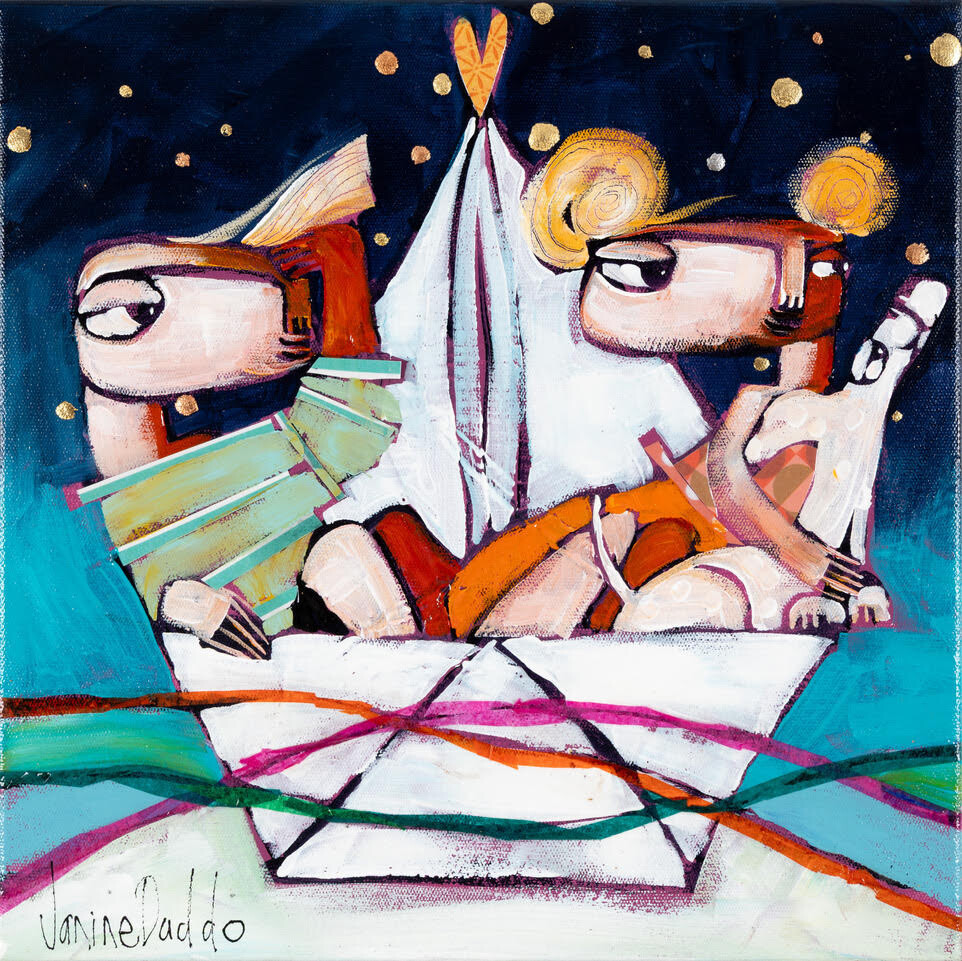 All they packed were dreams è un raffinato dipinto a tecnica mista su tela dell’artista australiana Janine Daddo, riconosciuta ed apprezzata a livello internazionale per il suo frizzante utilizzo del colore, della texture e della tecnica mista su tela. In quest’opera di medie dimensioni, due innamorati accompagnati dal loro cagnolino sono in viaggio in un oceano di colori, a bordo di una barchetta di carta. L’utilizzo sapiente dei colori scelto da Janine Daddo ci permette di immergerci nell’opera e di riuscire quasi a sentire il profumo di questa notte stellata.