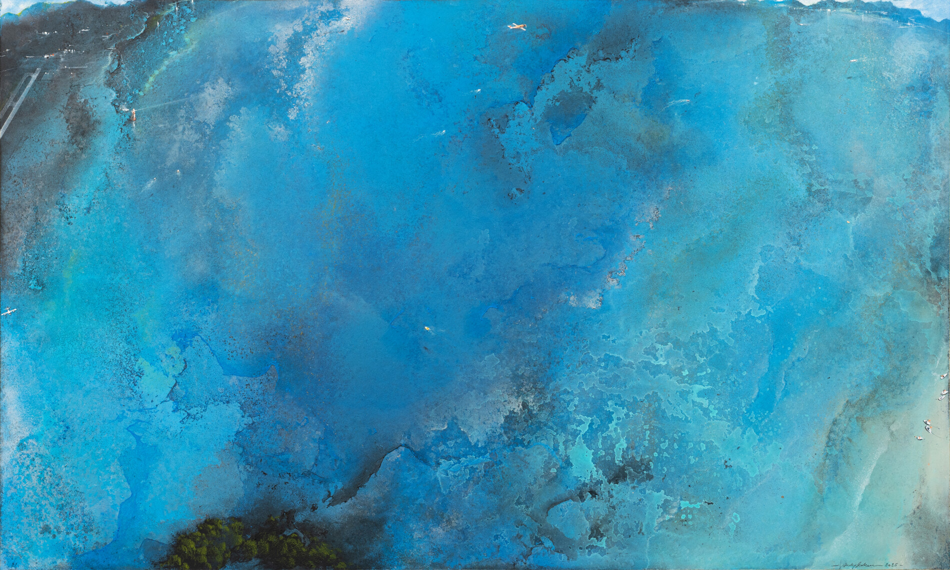 Questa Veduta presenta il mare come una mappa aperta, dove i blu si sovrappongono in passaggi morbidi che cambiano tono con la luce. Piccoli indizi visivi - l’aereo, il faro, le barchette - introducono una sorta di prima lettura, mantenendo però l’opera leggera e misteriosa. Una composizione raffinata, ideale per collezionisti che cercano opere capaci di adattarsi a diversi contesti e di rivelare nuove sfumature giorno dopo giorno.