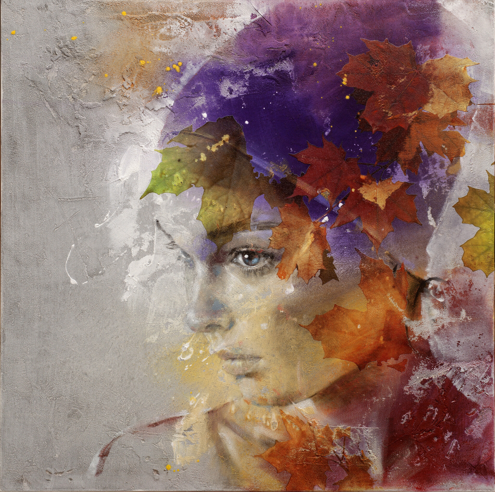 In Gemnes 15-125, Pier Toffoletti fonde l’anima umana con la poesia dell’autunno. Il volto femminile emerge da una coltre di foglie rosse, arancio e senape che sembrano accarezzare il pensiero, come sospinte dal vento della memoria. Sullo sfondo, una delicata cromia violacea sfuma nel bianco grezzo della tela, creando un contrasto che amplifica l’intensità espressiva dello sguardo. Le texture materiche evocano la ruvidezza della corteccia, ma anche la delicatezza delle emozioni. Un’opera che parla di cambiamento, introspezione e bellezza.