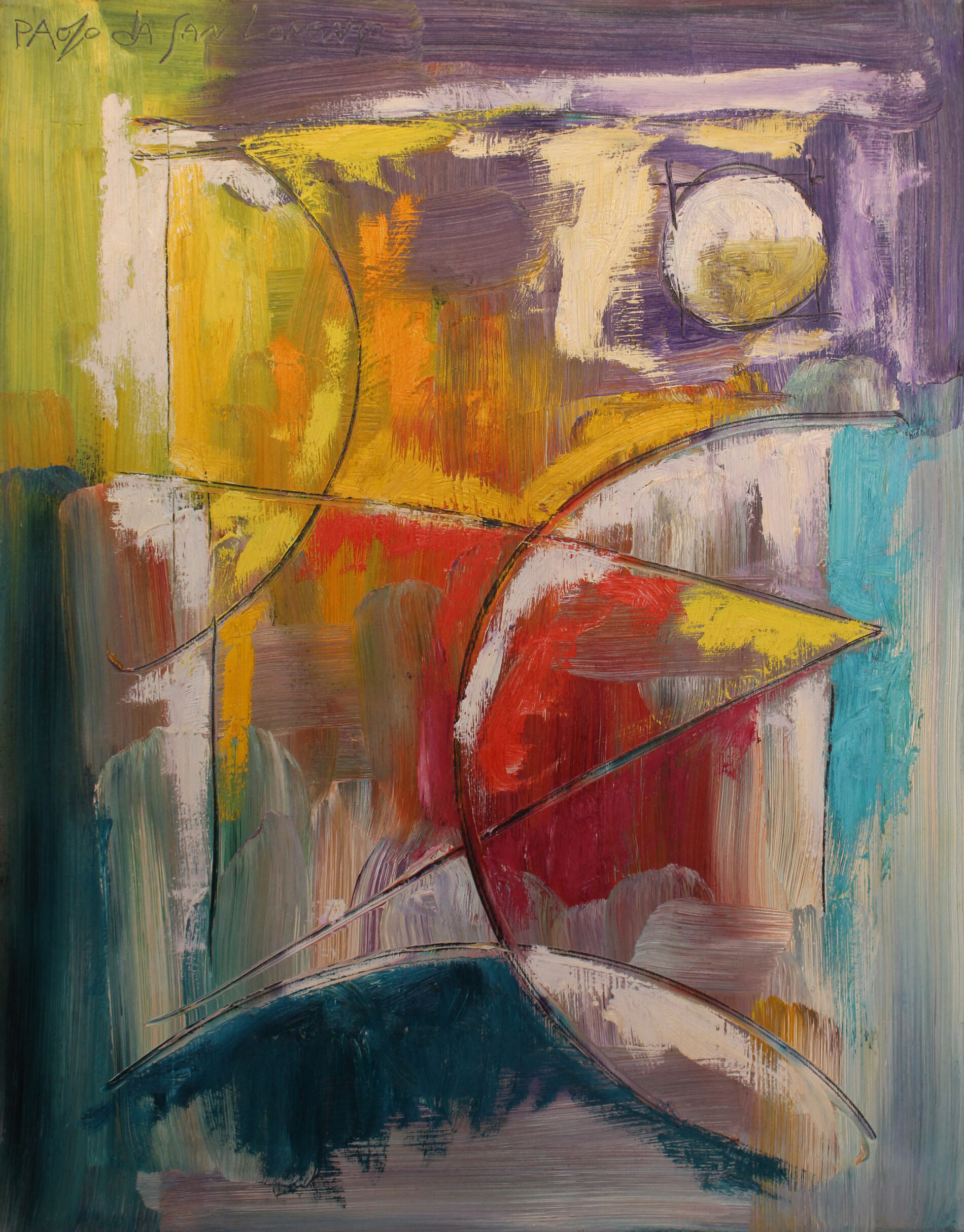 In Finestra sul porto, Paolo da San Lorenzo condensa spazio e luce in una composizione essenziale e vibrante. Campiture di blu profondo, senape e grigi attraversate da incisioni leggere evocano vento, mare e memoria. Una pittura materica e stratificata, sospesa tra geometria e suggestione emotiva.