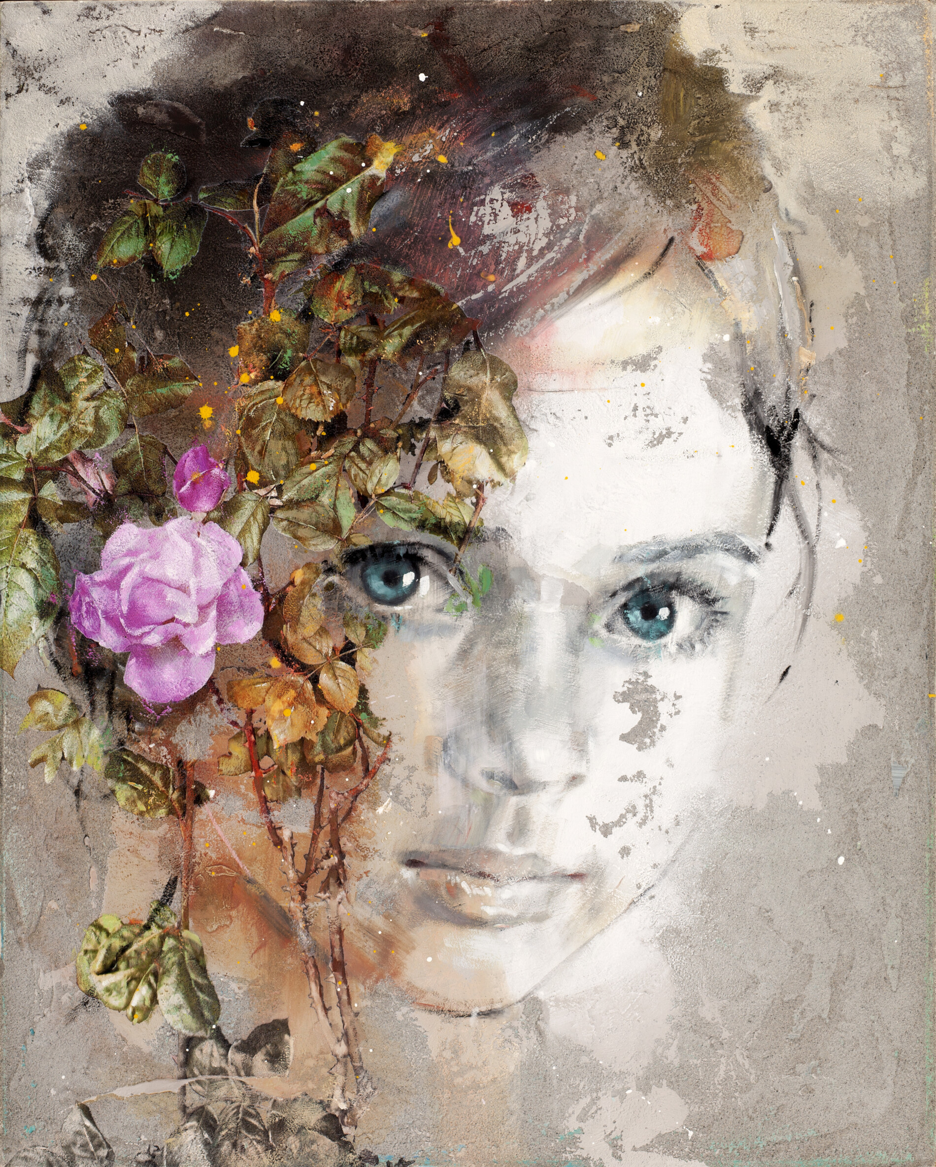 Le trasparenze pittoriche e gli inserti naturali evocano il fluire del tempo e la fragilità della memoria, collocando la figura in una dimensione sospesa tra realtà e immaginazione. Attraverso texture leggere e stratificazioni visive, l’artista costruisce un’immagine intensa e contemporanea, al tempo stesso enigmatica e profondamente emotiva.