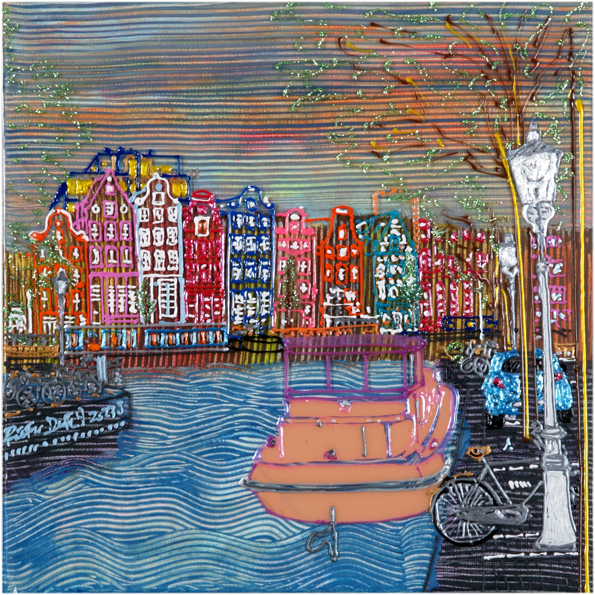 I colori accesi trasformano le case in una piccola esplosione visiva, quasi fossero personaggi diversi della stessa scena. L’acqua si muove in linee morbide, il cielo vibra, e la città sembra vivere in un ritmo tutto suo. Un’opera di piccole dimensioni ma densa, che cattura l’essenza giocosa, luminosa e irresistibile della capitale olandese.
