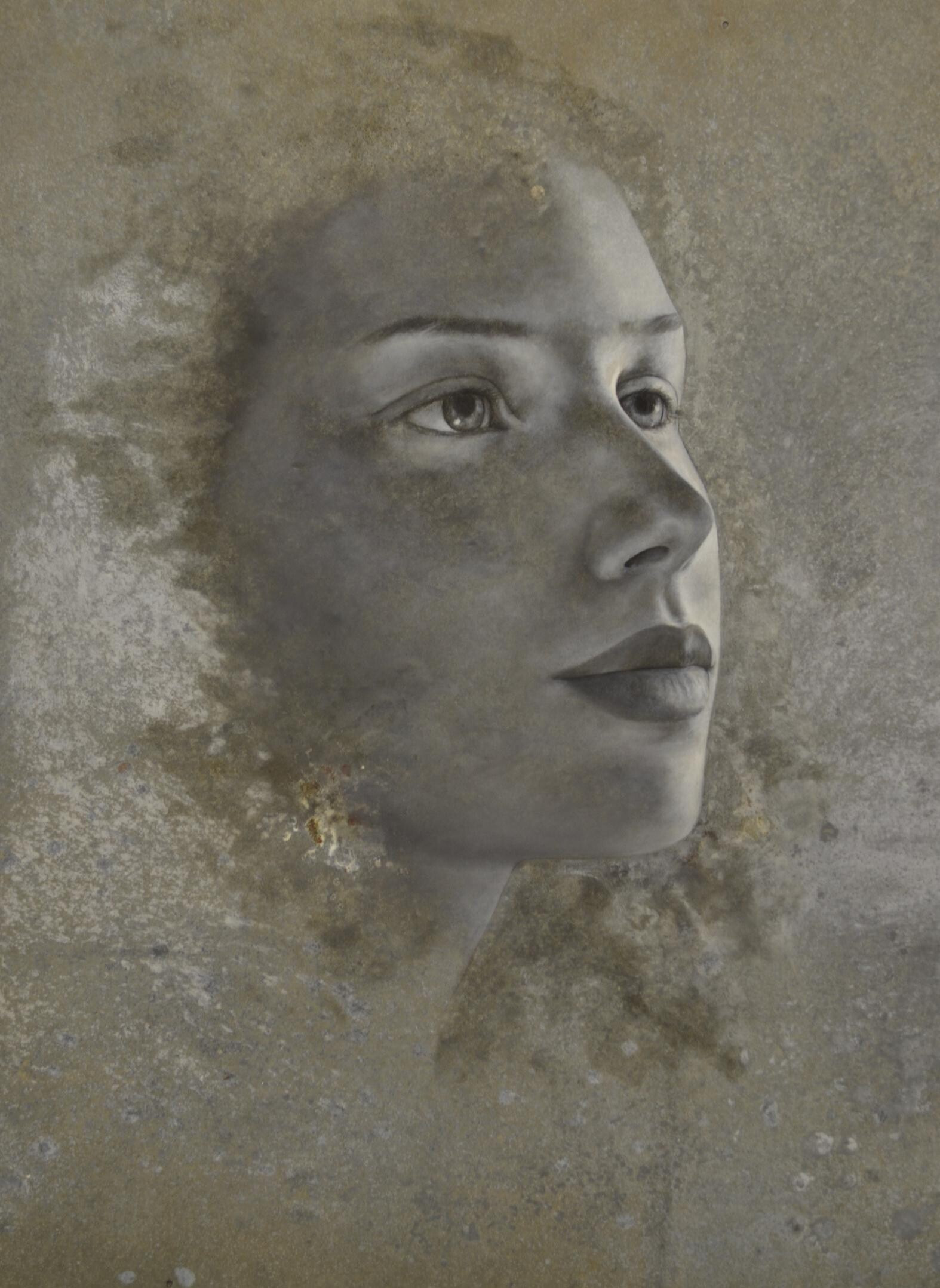 "Untitled" (2015) di Max Gasparini è un'opera in tecnica mista su lamiera che presenta una figura femminile in un momento di grande vulnerabilità e introspezione. La bellezza eterea della donna è resa attraverso l'uso di tonalità di grigio e bianco, con un contrasto netto tra la figura e lo sfondo scuro. La lamiera, come materiale industriale, crea una tensione visiva che accentua la delicatezza del corpo umano, mentre il trattamento pittorico dei volti e delle mani enfatizza la sensazione di distacco e riflessione. Gasparini utilizza il mezzo in modo innovativo, esplorando l'idea di fusione tra l'umano e il materiale.