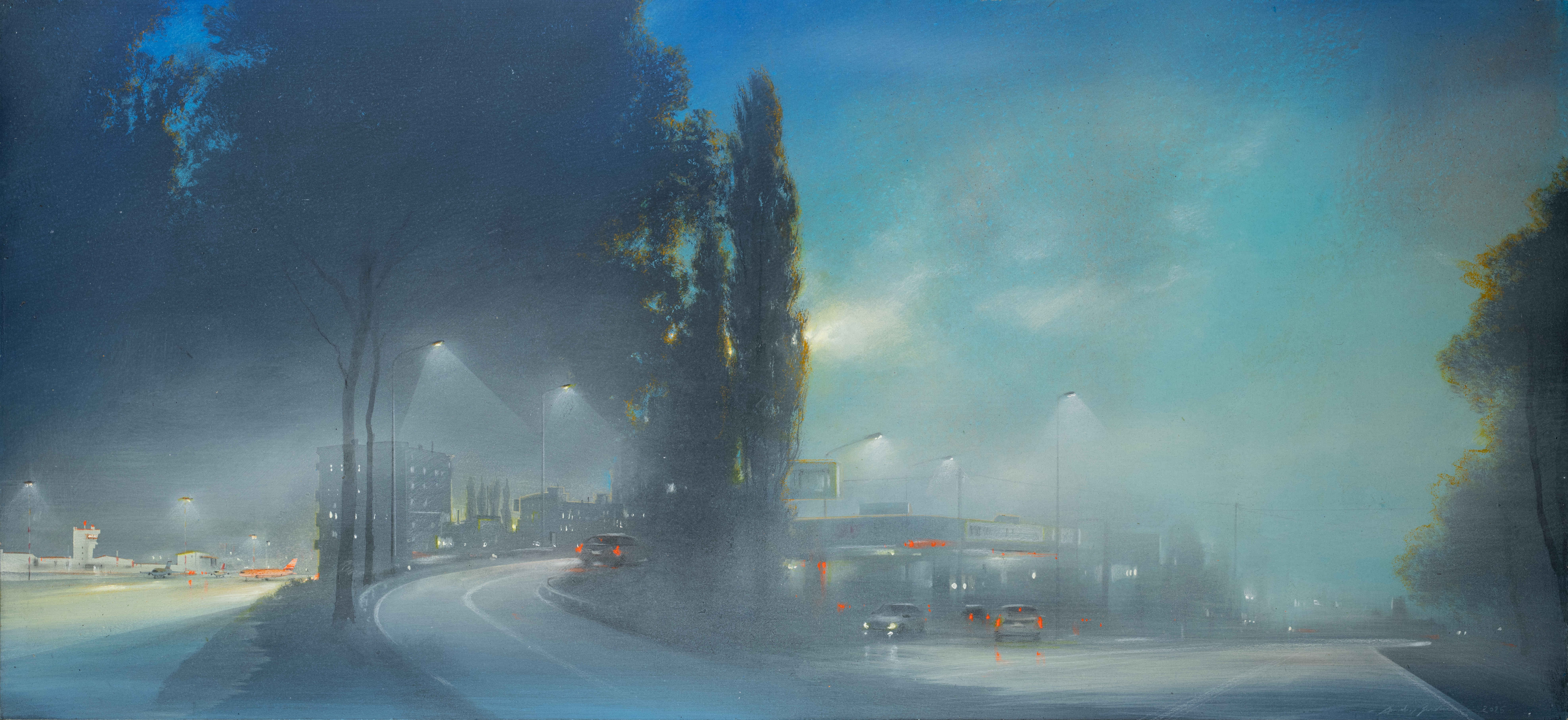 Elemento distintivo è la straordinaria capacità dell’artista di lavorare per velature, che gli vale il riconoscimento di autentico maestro delle trasparenze: la luce artificiale si diffonde nella nebbia, dissolvendo i contorni e creando profondità impalpabili.