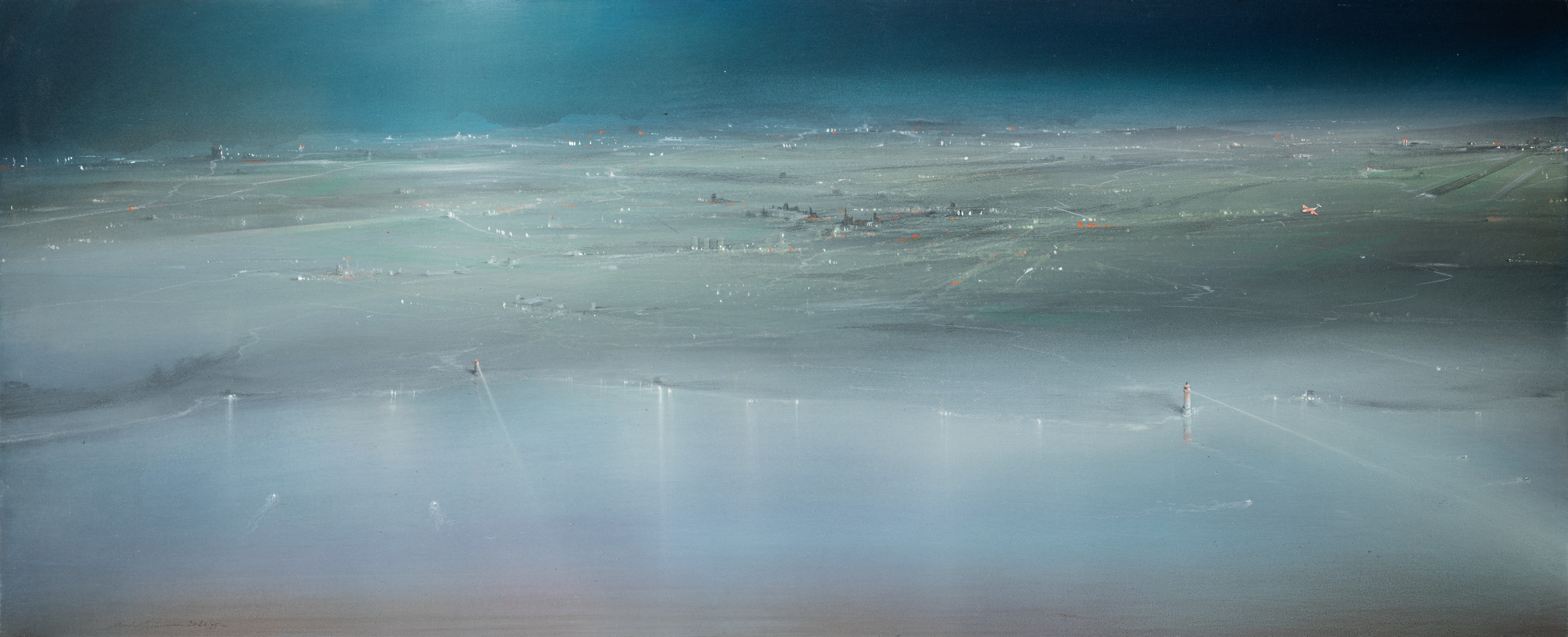 Avvicinandosi, emergono però con sorprendente precisione i dettagli: luci puntiformi, segnalazioni, piccoli elementi architettonici che affiorano dalla superficie pittorica come indizi visivi. È proprio in questo passaggio, dal generale al particolare, che si rivela la cifra distintiva di Andrea Giovannini, capace di costruire immagini che si svelano gradualmente allo sguardo.