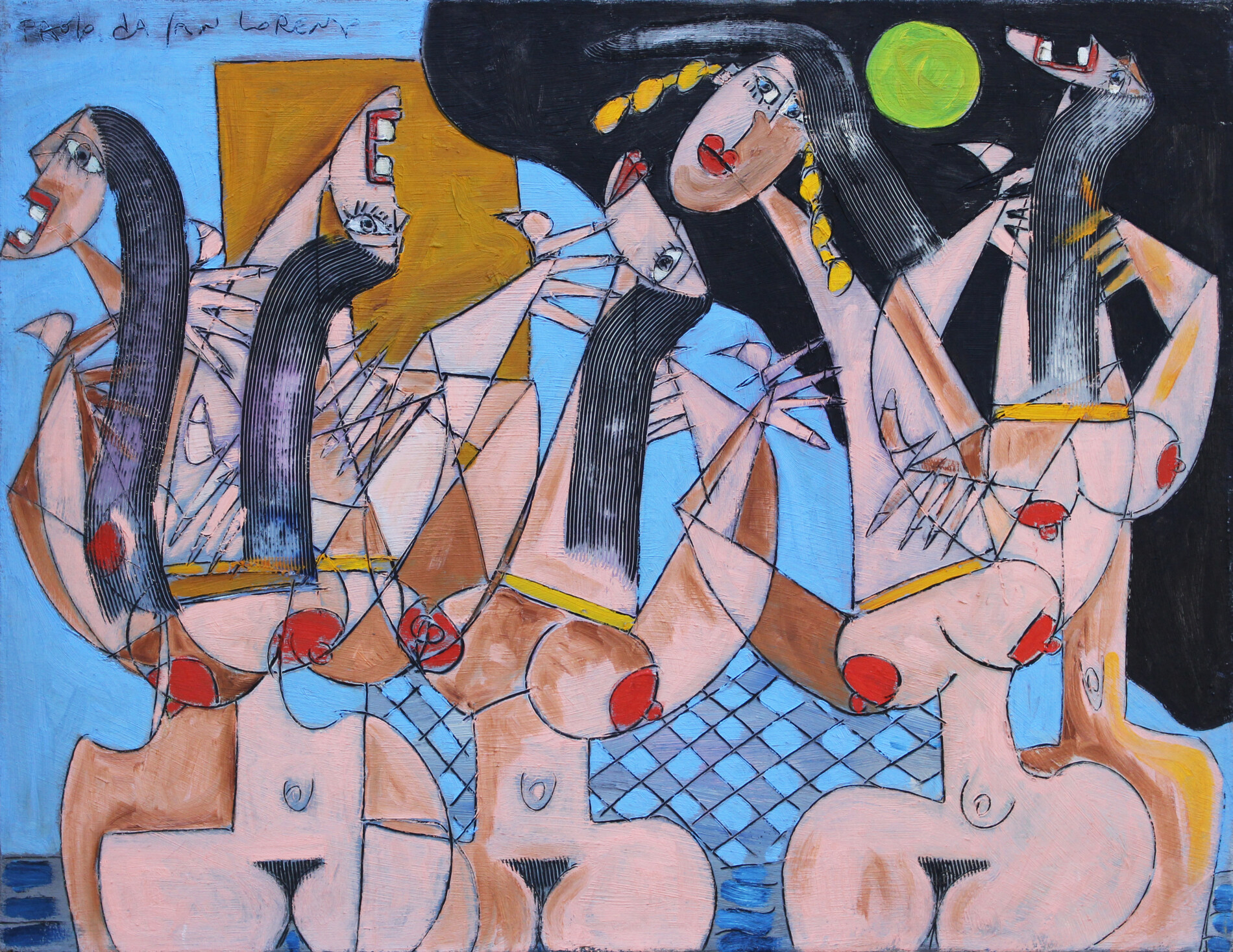 In “Bagnanti”, Paolo da San Lorenzo mette in scena una danza corale di corpi femminili, scomposti e ricomposti in un ritmo continuo. Le figure si intrecciano in un movimento quasi musicale, attraversate da segni graffiati e da piani cromatici di azzurro, nero e incarnato, con accenti di rosso che scandiscono la composizione. La pittura è energica, diretta, carica di vitalità: un inno al corpo, al gesto e alla libertà del segno.