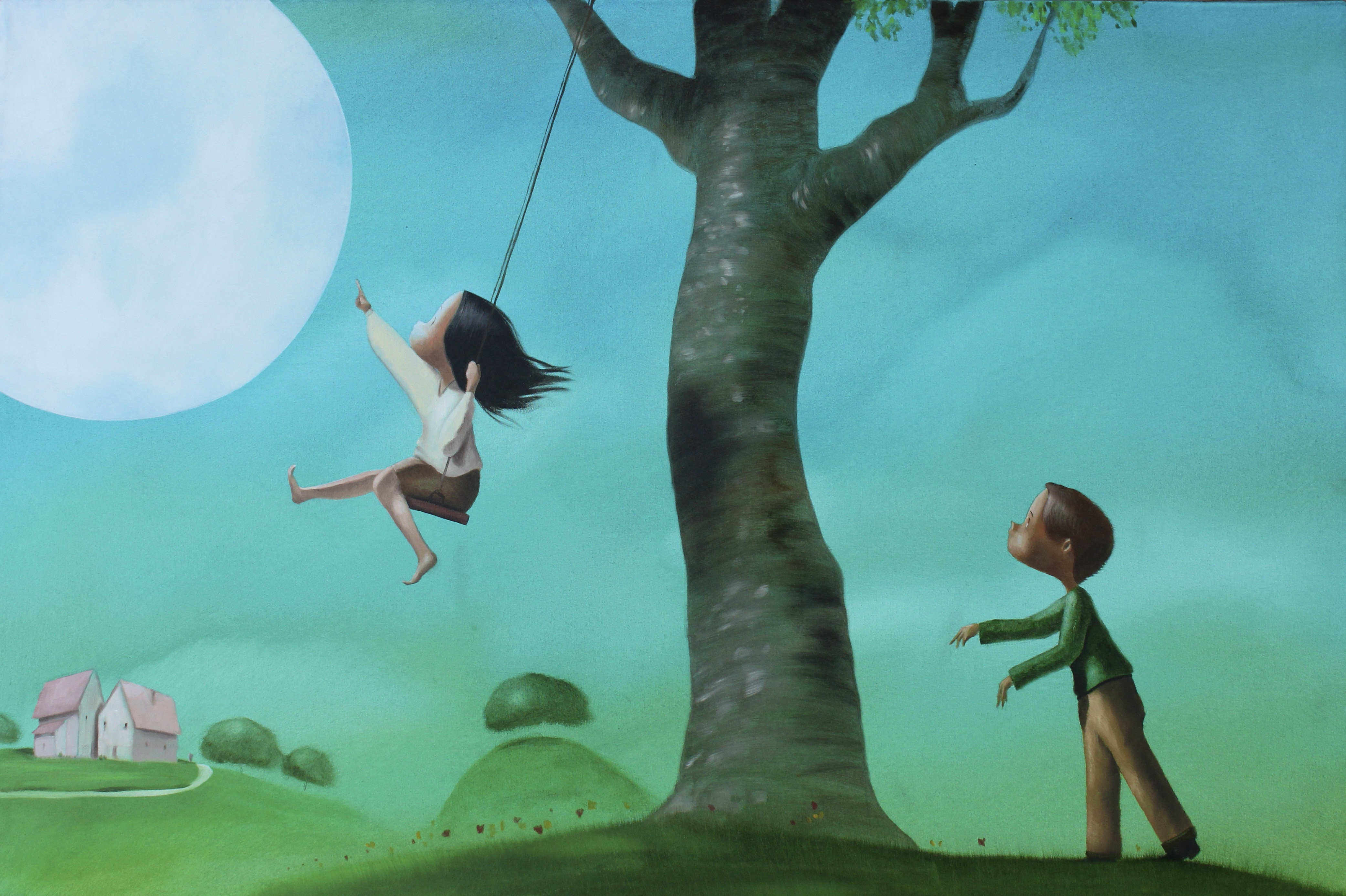 Sotto un cielo turchese, una bambina sembra quasi volare su un’altalena appesa a un grande albero e allunga la mano verso la luna, come se fosse a portata di dito. I capelli le danzano nell’aria, il volto è acceso da un desiderio semplice e immenso.