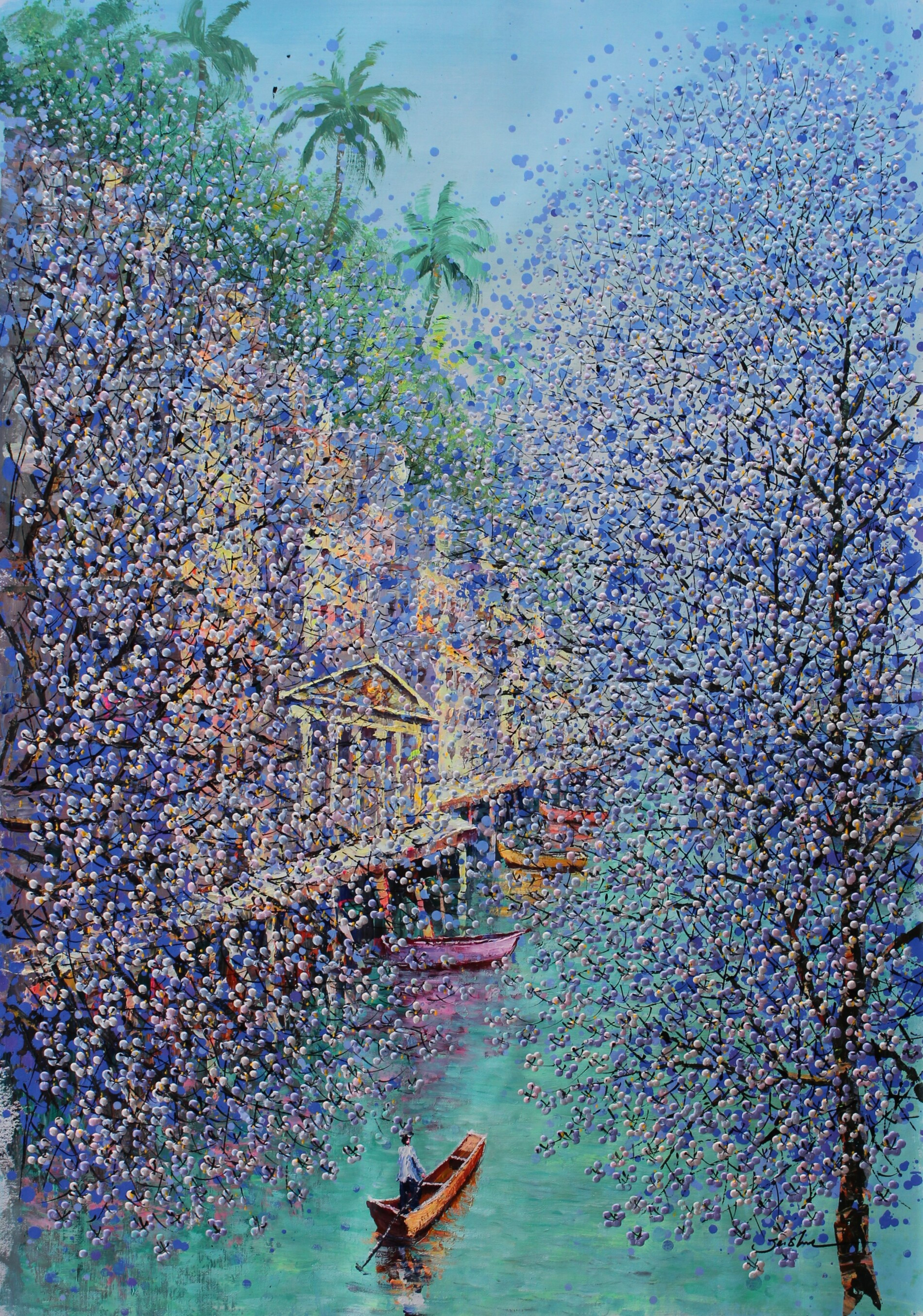 In questo dipinto a tecnica mista su tela, l'artista cinese Je Shen invita lo spettatore a entrare in un mondo sospeso tra sogno e realtà, dove la natura sembra respirare insieme all’acqua e alla luce. L’artista, con una tavolozza brillante, costruisce un paesaggio fluviale avvolto da folti alberi in fiore, lasciando intravedere tra i rami le case su palafitte e le barche colorate che animano la scena. Al centro, una figura solitaria sulla sua imbarcazione diventa il fulcro meditativo dell’opera, un invito alla quiete interiore che caratterizza gran parte della poetica di Je Shen.