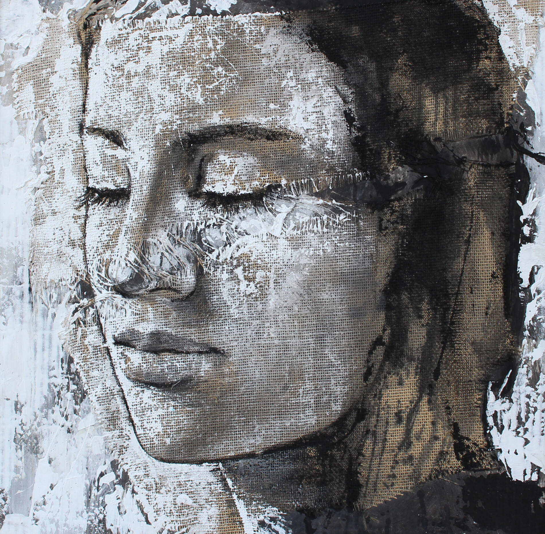 Un altro straordinario esempio della tecnica mista su juta, questa opera di Gasparini gioca con il contrasto tra la forza espressiva del volto umano e la superficie grezza. L'uso di tratti morbidi e decisi mette in risalto il delicato equilibrio tra emozione e materia, creando un effetto visivo di grande impatto emotivo.