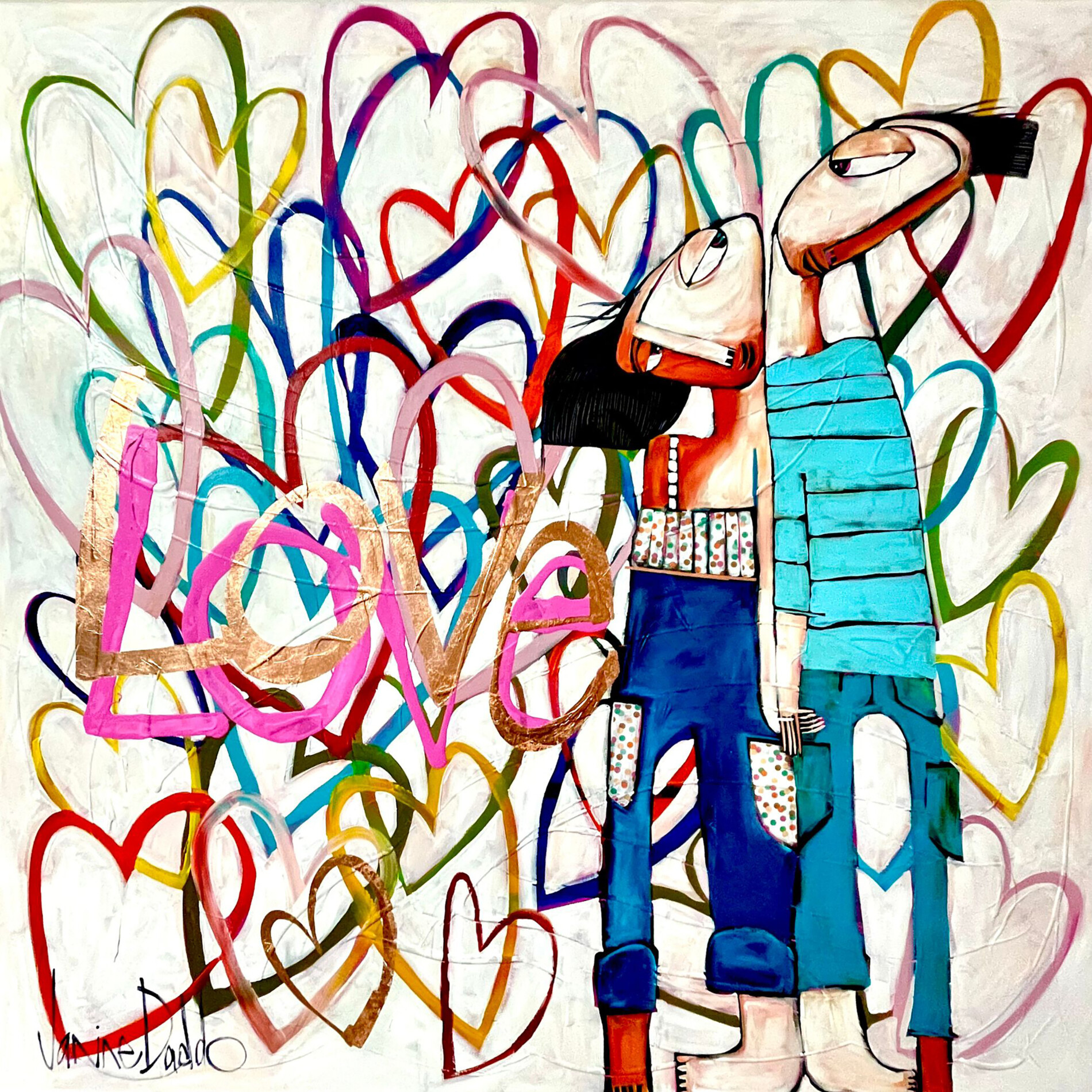 Due innamorati si tengono vicini, immersi in un campo di cuori che sembra crescere intorno a loro. Gli sguardi si cercano con dolcezza, come se tutto il resto svanisse, lasciando spazio solo alla presenza dell’altro. L’opera racconta di uno sguardo innamorato, capace di trasformare il mondo in qualcosa di semplice e profondamente bello.