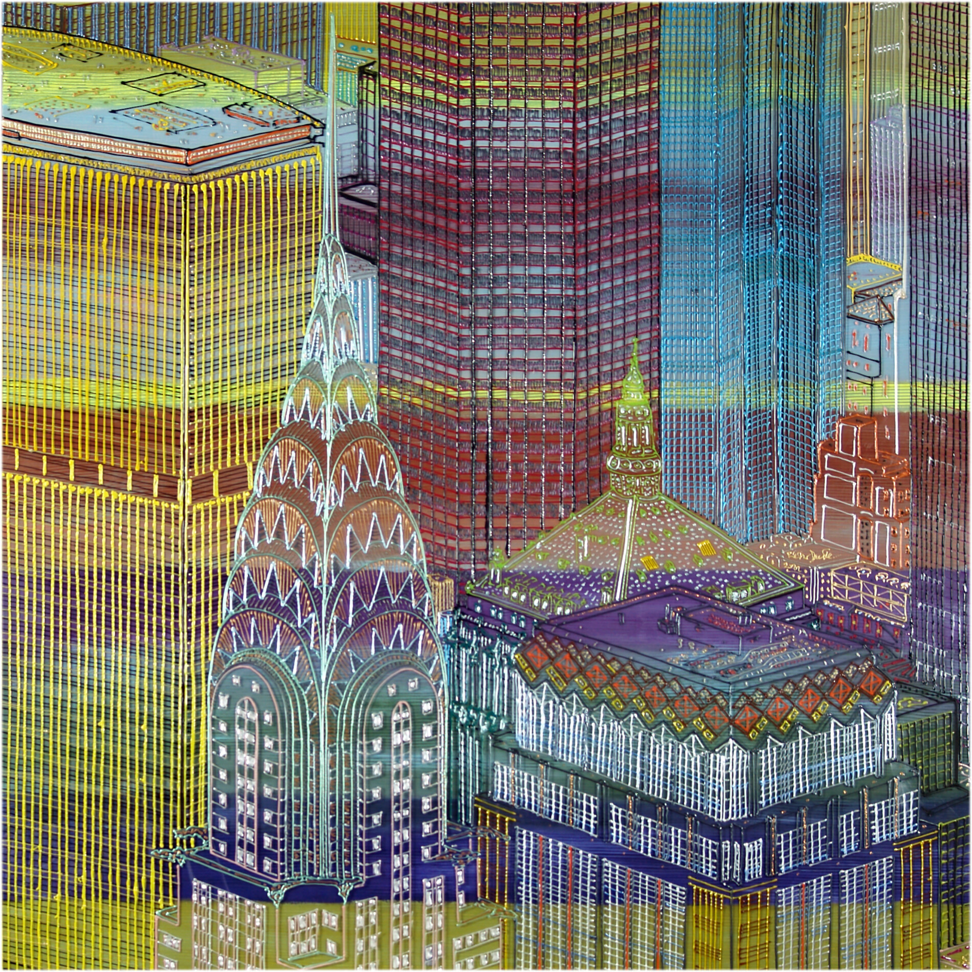 Un’opera vibrante e iper-dettagliata che cattura l’energia inarrestabile di New York. In “Aria Dura 322”, Pietro Dente stratifica policarbonato e pittura mista per ottenere una vista metropolitana intensa, quasi pulsante. Le architetture iconiche emergono tra linee cromatiche fitte e accensioni luminose che donano tridimensionalità alla scena. Il Chrysler Building spicca come totem urbano, simbolo di progresso e memoria.