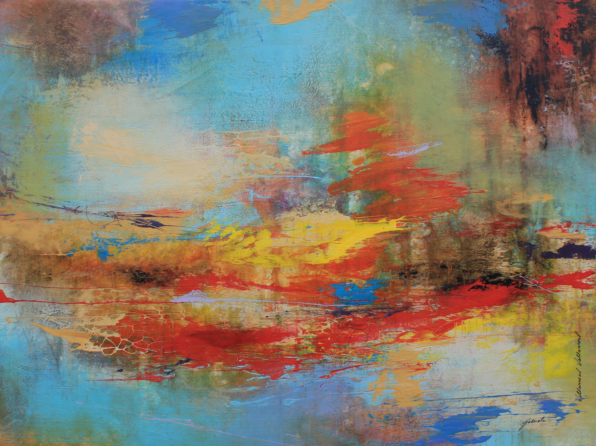 Rosso, giallo e toni terrosi si fondono in una danza cromatica intensa, attraversata da tracce e segni che imprimono energia al dipinto. La ricerca di Gabriela Villareal si esprime qui nella forza del gesto pittorico, che trasforma la tela in un campo vibrante di emozioni.