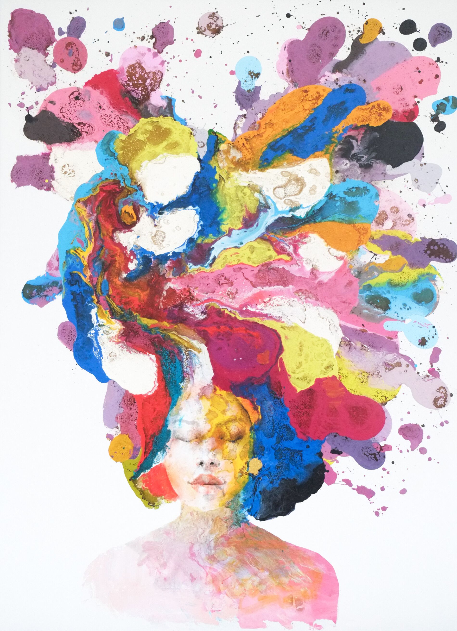 Da questo volto raccolto in un silenzio profondo si sprigiona un’esplosione di colore che sembra nascere direttamente dall’interiorità. Colature di smalti si espandono in forme libere, vibranti, come un rituale di energia che prende corpo sulla tela. Le tonalità intense dei rosa, blu, gialli, aranci e accenti di viola si intrecciano in un movimento organico e pulsante, contrastando con la delicatezza della figura. L’insieme crea un equilibrio sorprendente tra quiete e vitalità, trasformando l’emozione in gesto e colore.