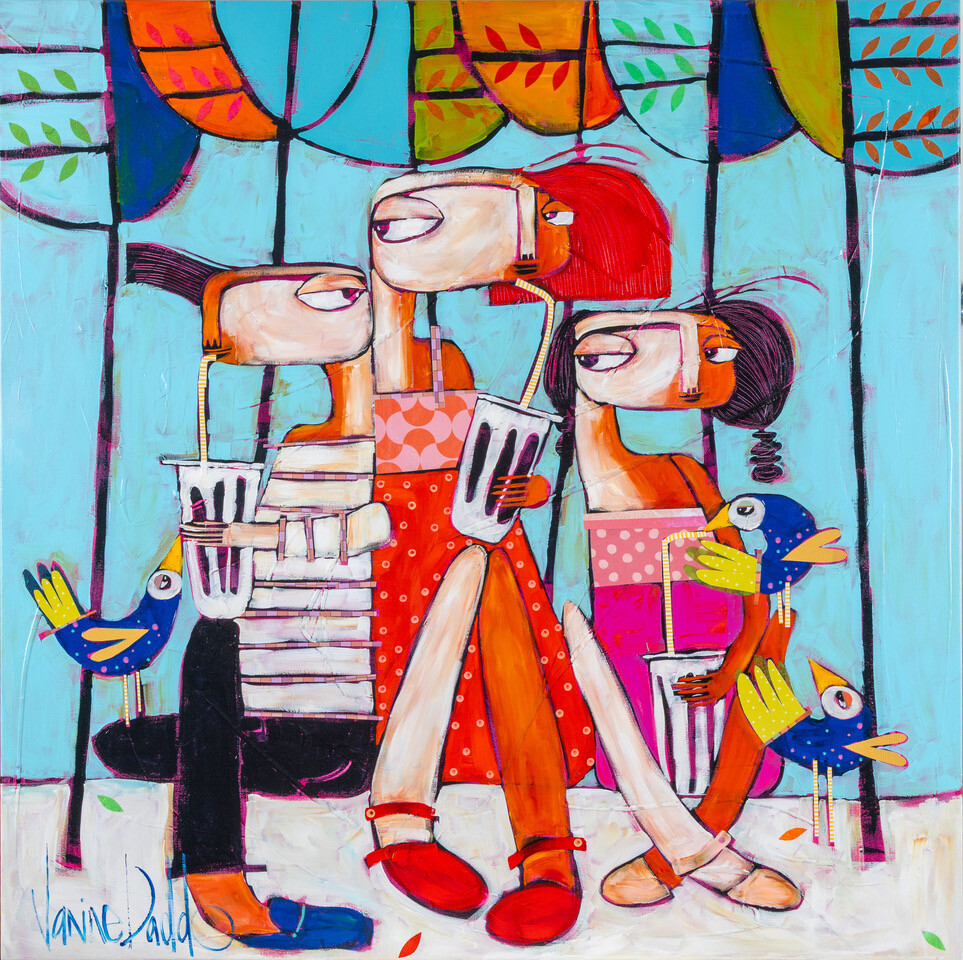 In quest’opera di medie dimensioni Janine Daddo racconta la gioia di un momento speciale condiviso tra una mamma e i suoi bambini: una domenica, tre milkshake e la semplicità dello stare insieme. Non serve altro per sentirsi al settimo cielo.