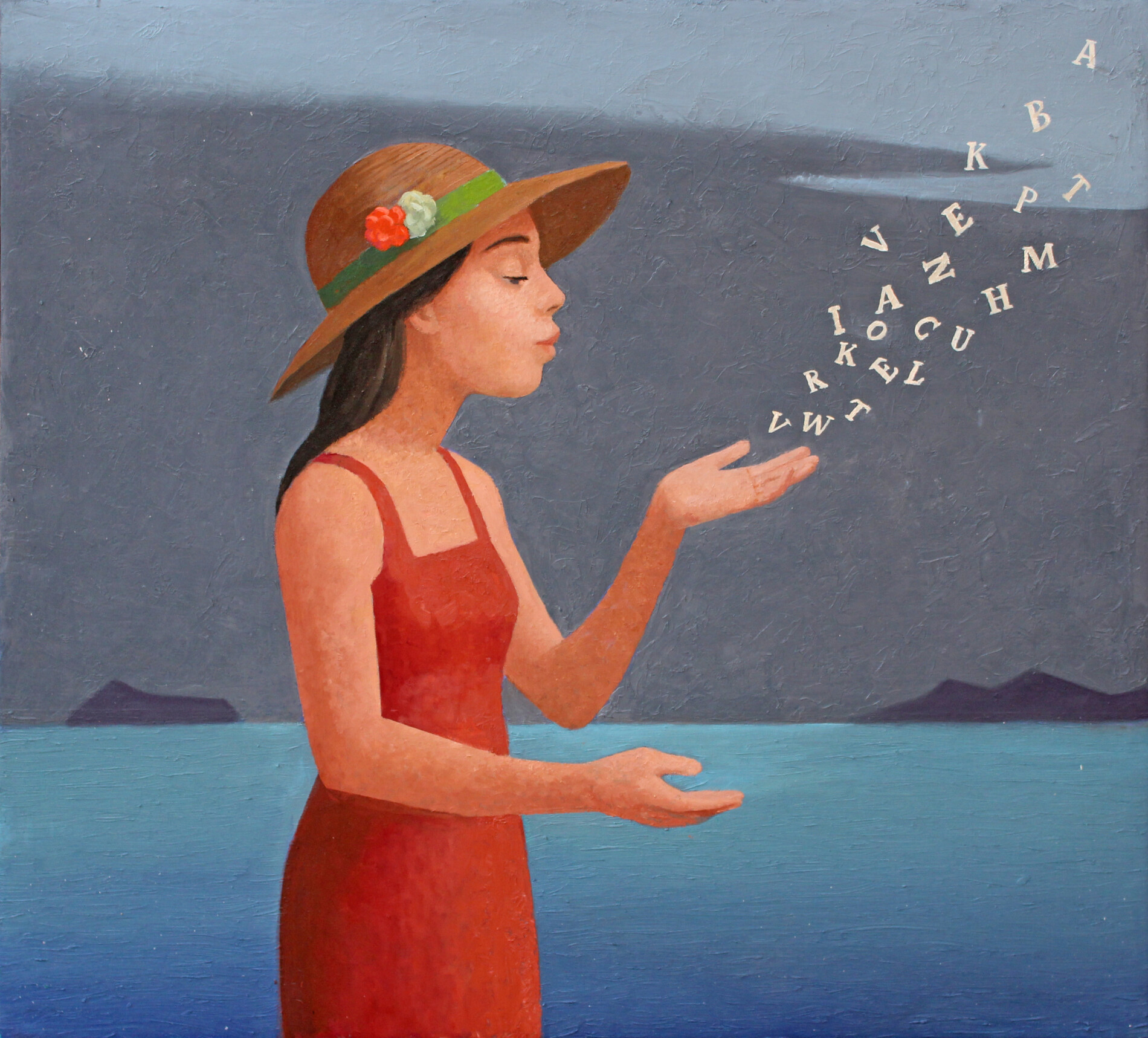 In questo olio su tela di medie dimensioni, una giovane donna lascia andare nell’aria una scia di lettere, come parole che cercano il loro posto nel mondo. Il gesto è lieve, delicato, quasi un soffio che libera ciò che nasce dentro di lei. Il paesaggio quieto che la circonda- il mare immobile, le isole lontane, il cielo compatto - amplifica il senso di calma e di attesa.