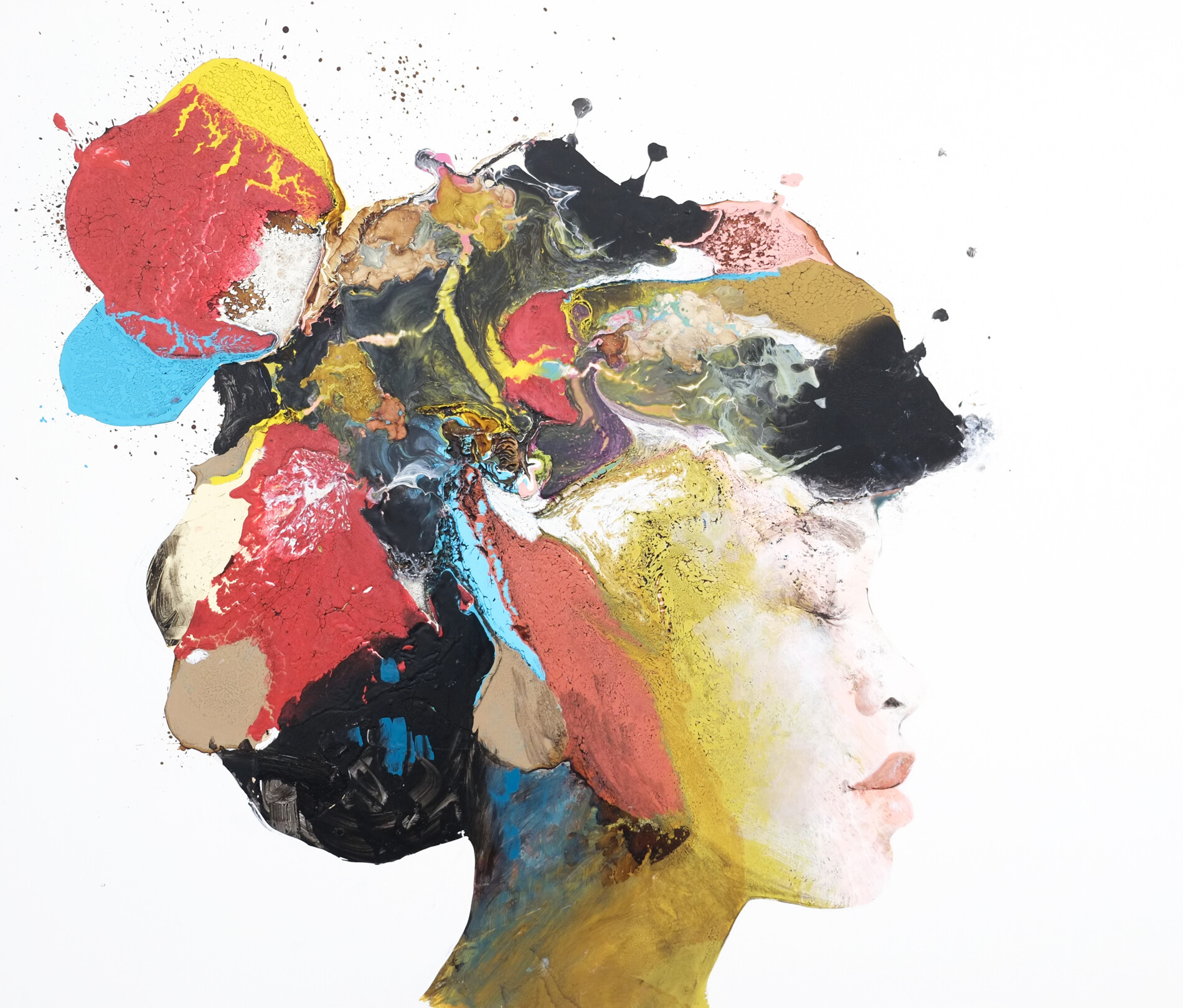 Un moto avvolgente di colori introduce una figura femminile, come se la materia pittorica la accogliesse e la rivelasse nello stesso istante. Il profilo delicato emerge con naturalezza, mentre la costellazione di rossi, neri, ocra e turchesi si intreccia in un movimento quasi tellurico. Le colature e gli spessori degli smalti danno vita a un dinamismo che si estende oltre la figura, trasformando ciò che la circonda in un campo pulsante di sensazioni e immagini interiori. Un’opera che unisce grazia e impeto in un’unica visione fluida.