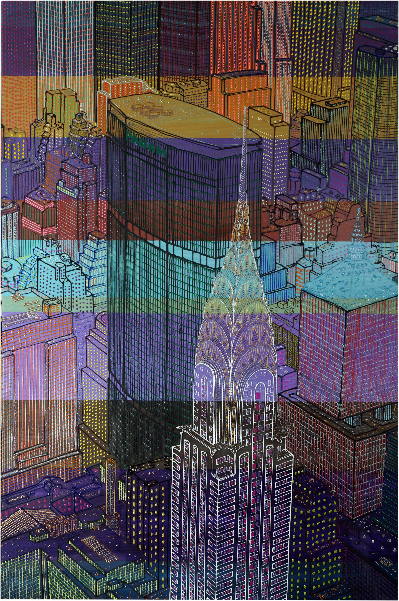 In questa grande ed impattante composizione, Pietro Dente celebra il fascino verticale del Chrysler Building, simbolo dell’identità architettonica newyorkese. Le linee nette si fondono con la brillantezza delle superfici illuminate, creando un contrasto vibrante tra luce artificiale e profondità urbana. L’uso sapiente del policarbonato dona una tridimensionalità che amplifica l’effetto ottico delle geometrie, rendendo l’opera una vera icona visiva. Un’esplosione di colori stratificati – dal viola al giallo oro – avvolge lo spettatore in un paesaggio notturno futuristico e poetico.