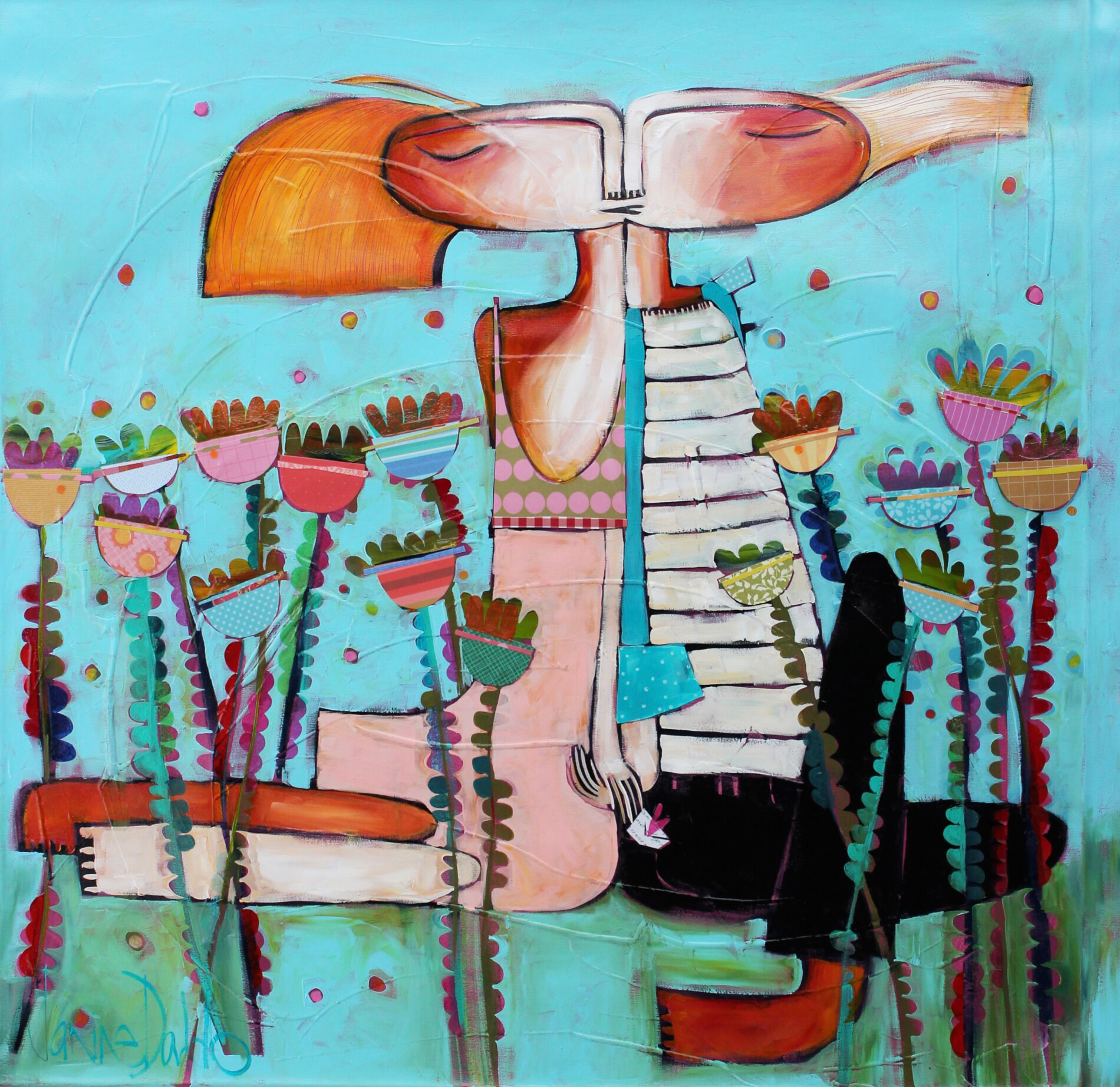 L’arte di Janine Daddo è immediatamente riconoscibile: figure stilizzate, volumi essenziali e una pittura materica fatta di stratificazioni, pattern decorativi e colori vibranti. Le sue opere trovano un equilibrio delicato tra racconto e astrazione, aprendosi a letture intime e personali. Mondi sospesi e poetici, dove la semplicità del segno trasforma la quotidianità in emozione senza tempo.