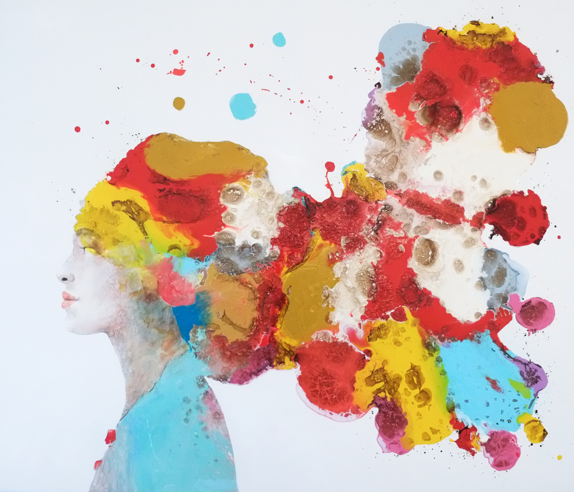 Le colature e le trasparenze creano un movimento leggero, quasi a suggerire un vento interiore che guida la scena. Una composizione che trasforma l’emozione in gesto e lascia affiorare una fragile intensità.