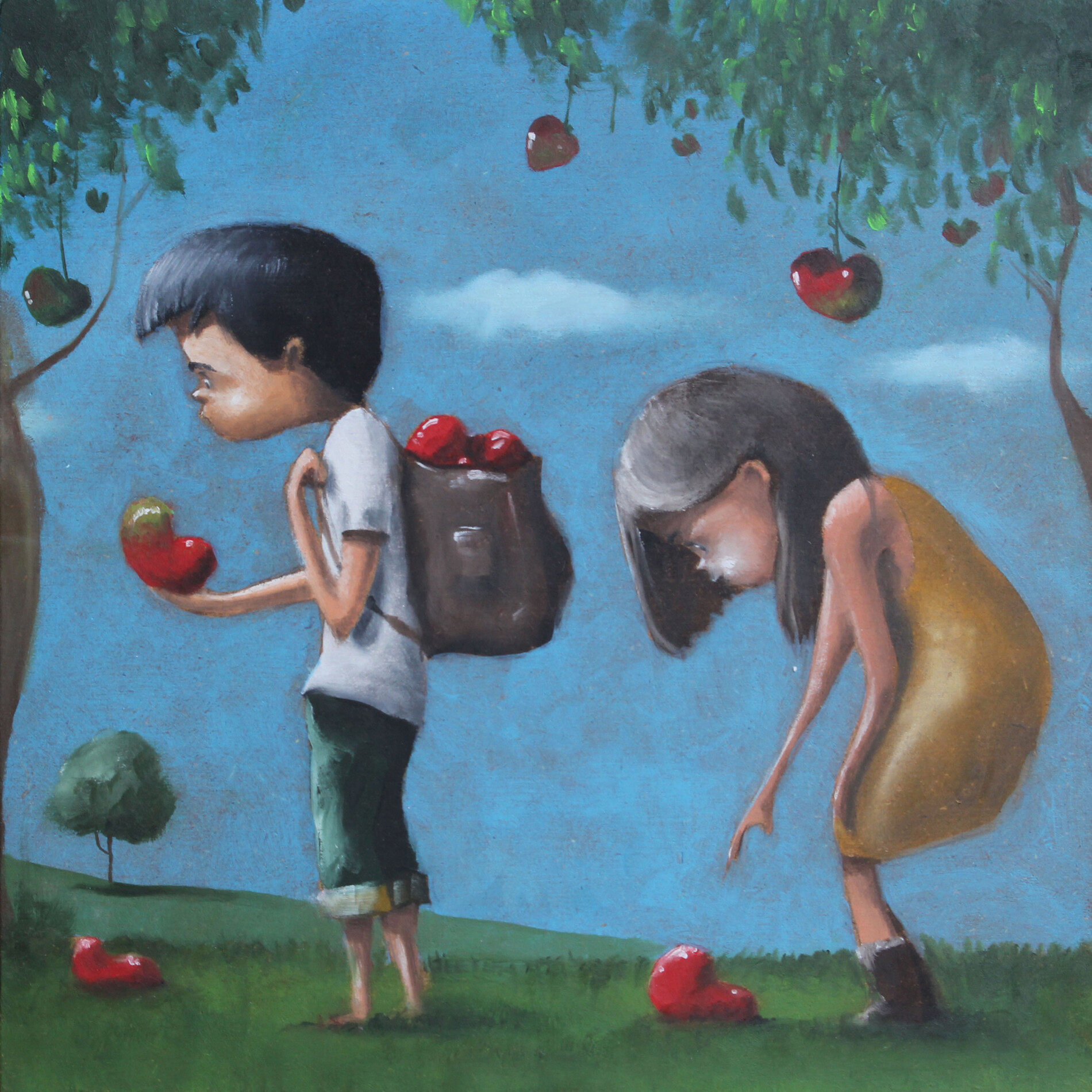 In questa delicata opera di piccole dimensioni, Diego Santini immagina un giardino incantato dove gli alberi donano cuori al posto dei frutti. Due bambini li raccolgono con cura, come se maneggiassero emozioni vive. Con il suo tratto poetico e il calore dell’olio su legno, l’artista trasforma la scena in una piccola fiaba visiva, un simbolo di tenerezza e condivisione che invita a riscoprire la magia nascosta nei gesti semplici.